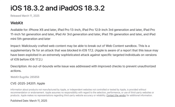 苹果官网显示,iOS 18.3.2更新主要修复了自iOS 17.2就发现的WebKit安全漏洞(CVE-2025-24201)。