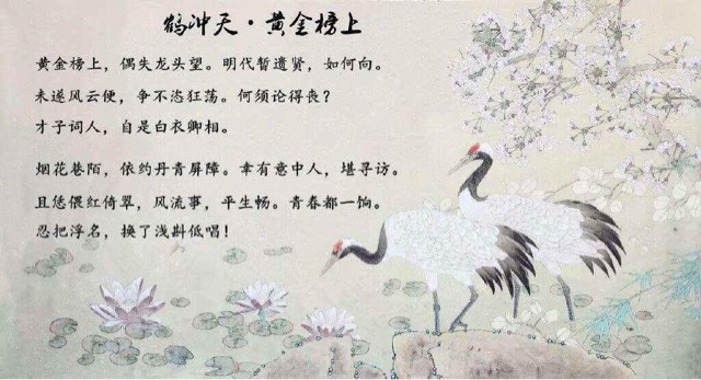 “黄金榜上,偶失龙头望。明代暂遗贤,如何向。未遂风云便,争不恣游狂荡。何须论得丧?幸有意中人,堪寻访。且恁偎红倚翠,风流事,平生畅。青春都一饷。忍把浮名,换了浅斟低唱!”