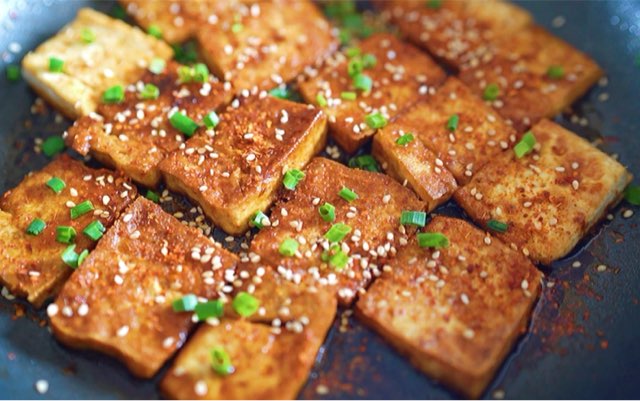 1.嫩豆腐切2厘米厚的薄片,热锅中倒入3汤勺植物油,油温成热。 2.煎表面金黄后,在豆腐中间用筷子扎几道小口,为了让豆腐更加入味,煎3分钟翻面。 3.待两面金黄撒上盐、少许麻辣鲜和辣椒面,孜然粉、白胡椒粉都撒在豆腐上。油锅一边炸些辣椒丝,将辣椒丝炸到酥脆盛出。 4.豆腐淋上香油用铲子切成两厘米宽的段,盛出摆盘。撒上香葱即可。 作为吃货,并且吃货多家铁板豆腐路边摊的我,总结了几点,豆腐一定要用嫩豆腐,这样吃起来才爽口,有那种入口即化的感觉,其次豆腐要么切薄一点,要么弄成小碎块,不然不入味。当然如果你用的是老一点的豆腐的话(个人觉得这种其实油炸出来更好吃一点),我就建议你最好煎久一点形成黄黄的外壳,这样香一点,最重要的是这种最好要薄,不然不入味就不好吃,也白搭。 1、含钙量高。黄豆原料本身即含较多钙。更重要的是,在豆腐制作过程中加入的凝固剂,如石膏(硫酸钙)和卤水(含氯化钙)等使豆腐含钙量猛增。再加上豆腐的消化吸收率达95%以上。两小块豆腐,即可满足一个人一天钙的需要量。 2、抗癌。豆腐中含有异黄酮素能有效抑制癌细胞的产生,具有抗癌的功效。 3、对眼睛干涩有好处。豆腐中含有丰富豆腐维生素A,我们在缺乏维生素A时,眼睛往往感到发干、发涩,容易疲劳,严重时眼白表面干燥、皱缩,甚至导致角膜溃疡。 4、预防血管硬化。豆腐中的脂肪以不饱和脂肪酸为主,其中的卵磷脂有助于血管壁上的胆固醇代谢,预防血管硬化。 5、清热解毒。豆腐味甘性凉,入脾、胃、大肠经,具有益气和中、生津润燥、清热解毒的功效。铁板豆腐的做法步骤
